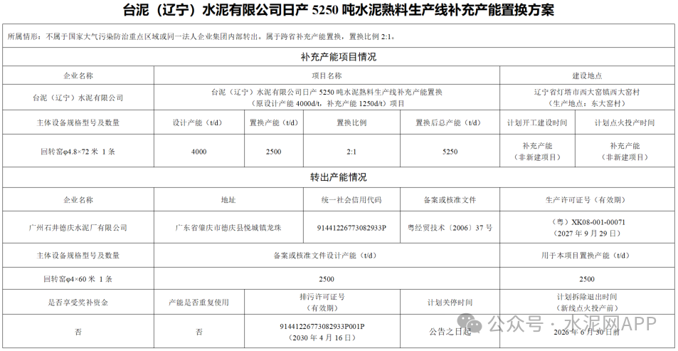 置換方案顯示,臺(tái)泥(遼寧)水泥4000t/d熟料生產(chǎn)線補(bǔ)充產(chǎn)能1250t/d,補(bǔ)齊后產(chǎn)能5250t/d,退出產(chǎn)能來自廣州石井德慶水泥一條2500t/d生產(chǎn)線,置換比例2:1。