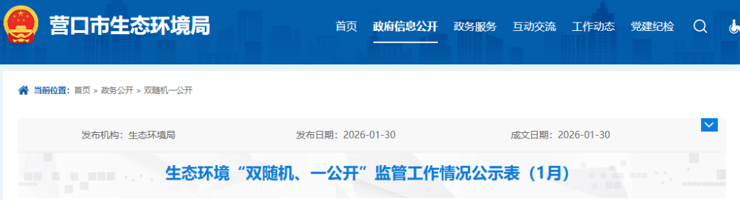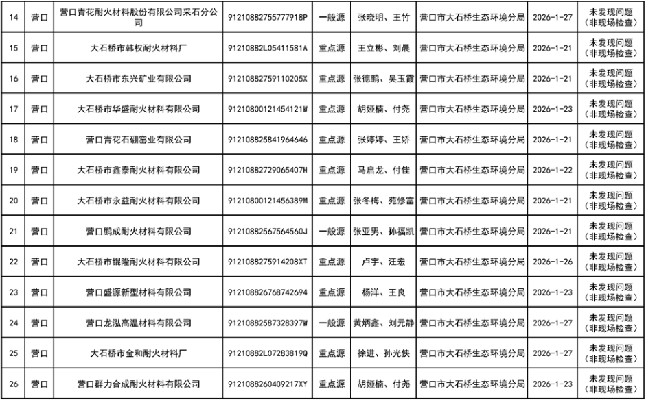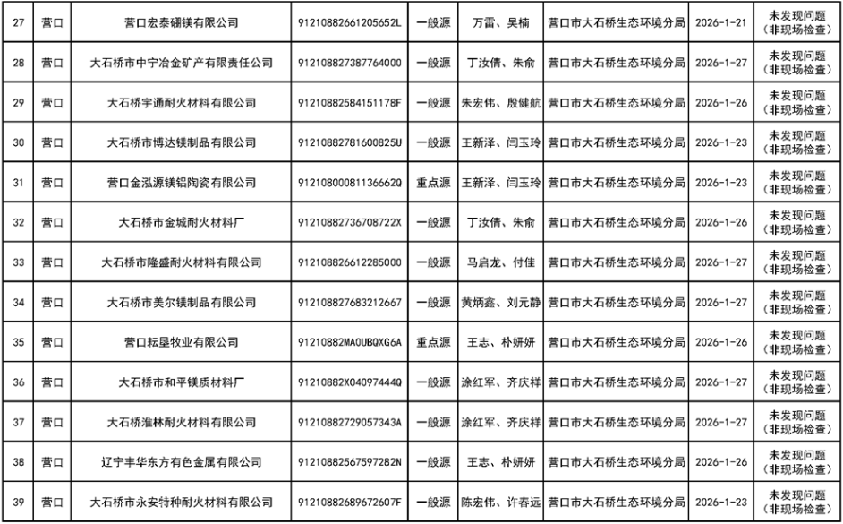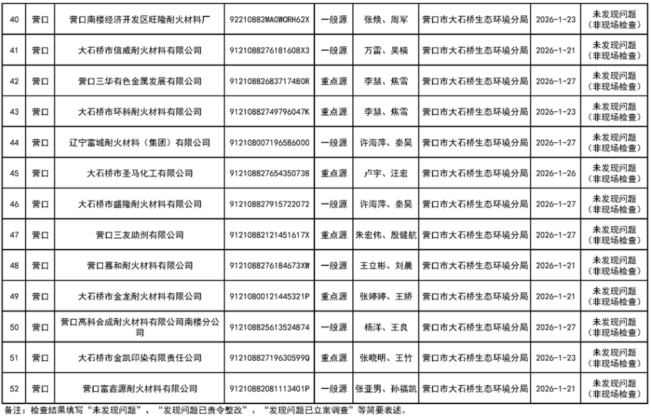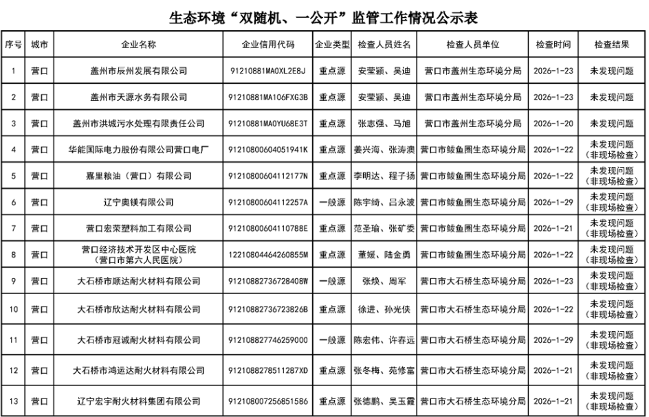 營口市生態(tài)環(huán)境局公示對遼寧奧鎂、宏宇耐火等52家企業(yè)“雙隨機(jī)、一公開”監(jiān)管工作情況
