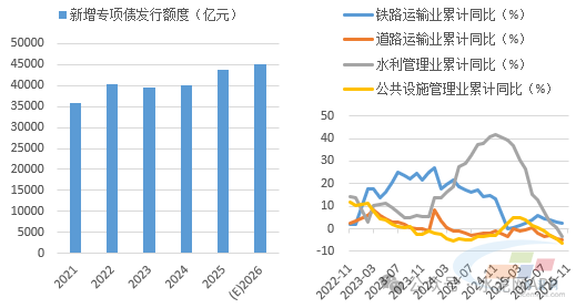 基建方面,我們判斷2026年投資將回正,基建端水泥需求將有改善?!笆逦濉币?guī)劃建議指出,加強謀劃論證,實施一批重大標志性工程項目,高質(zhì)量推進國家重大戰(zhàn)略實施和重點領(lǐng)域安全能力項目建設(shè)。2026年作為“十五五”開局之年,預(yù)計專項債、超長期特別國債發(fā)行規(guī)模將出現(xiàn)提高,基建投資將出現(xiàn)回正,但在化債政策影響下,水泥需求關(guān)系密切的交通類和市政基建投資或?qū)⒀永m(xù)低迷態(tài)勢,預(yù)計基建整體對水泥需求支撐將有所改善,但力度可能仍然不強。