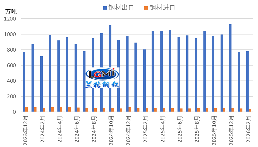 2026年開年,我國鋼材進出口均呈現(xiàn)同比下降特征。據(jù)海關(guān)總署統(tǒng)計數(shù)據(jù)顯示,出口方面,1-2月我國累計出口鋼材1559.1萬噸,同比下降8.1%;其中,1月份出口775.4萬噸,同比下降13.3%;2月份出口783.7萬噸,同比下降2.5%。進口方面,1-2月份,我國累計進口鋼材82.7萬噸,同比下降21.7%;其中1月份進口45.8萬噸,同比下降8.4%;2月份進口36.9萬噸,同比下降32.9%。