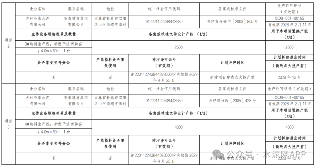 3月13日,吉林省工信廳發(fā)布吉林亞泰水泥有限公司日產(chǎn)9000噸水泥熟料生產(chǎn)線建設(shè)項目變更產(chǎn)能置換方案的公示。結(jié)合新舊置換方案顯示,原建設(shè)主體由吉林亞泰建材環(huán)??萍加邢薰咀兏鼮榧謥喬┧嘤邢薰?;原計劃點火投產(chǎn)時間由2027年12月變更為2028年12月;置換產(chǎn)能退出時間由2027年12月變更為2028年12月。