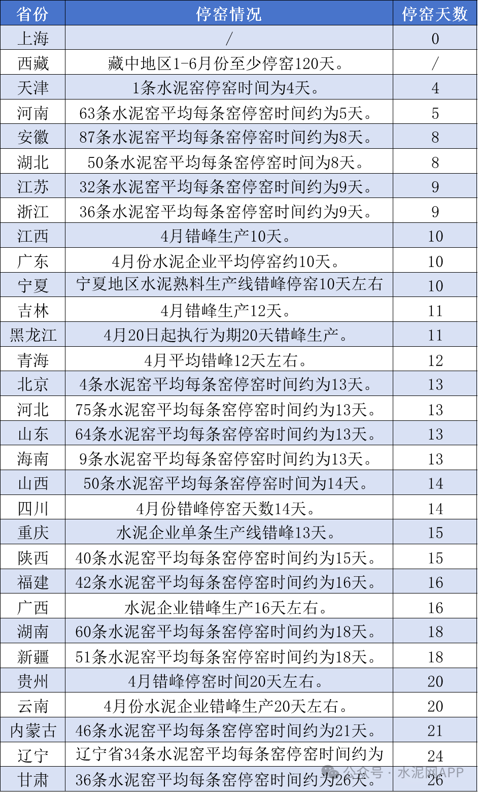 據(jù)了解,近期多地開啟新一輪錯峰停產(chǎn)。據(jù)河北省建筑材料工業(yè)協(xié)會發(fā)布,4月-10月(7個月)非采暖季期間,全省水泥熟料生產(chǎn)企業(yè)自律錯峰生產(chǎn)停窯合計85天。其中4月至6月、10月:每月自律錯峰生產(chǎn)停窯10天,一般安排在每月下旬。7月至9月:每月自律錯峰生產(chǎn)停窯15天,一般安排在每月中下旬。